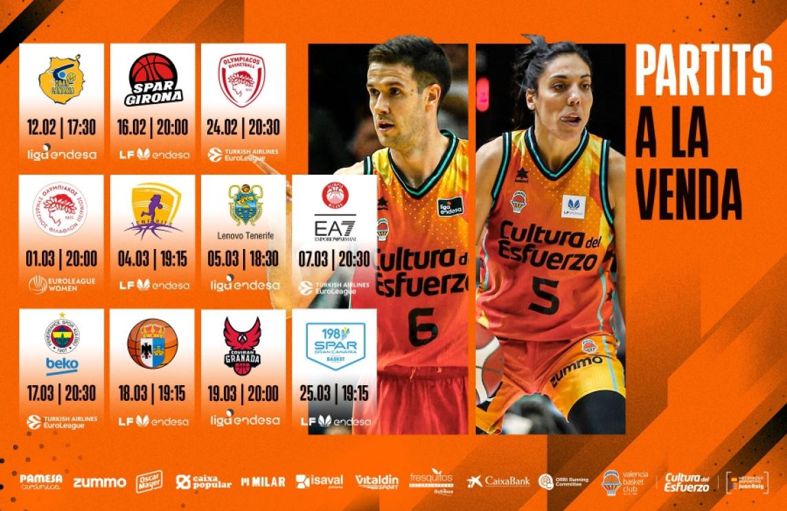La visita en lliga de Spar Girona és un dels al·licients en el calendari femení, a més d'altres quatre enfrontaments, davant Olympiakos en Euroleague Women i davant Tenerife, Bembibre i Spar Gran Canària en Liga Femenina Endesa. Els xics es mesuren a rivals de la talla de Gran Canària, Tenerife o Granada en acb, a més de rebre a equips com Olympiakos, Emporio Armani Milà o Fenerbahçe Beko en els duels europeus que ixen a la venda. També queden a disposició paquets d'entrades entre diversos partits, amb motiu de poder estalviar uns pocs de diners en la teua compra.