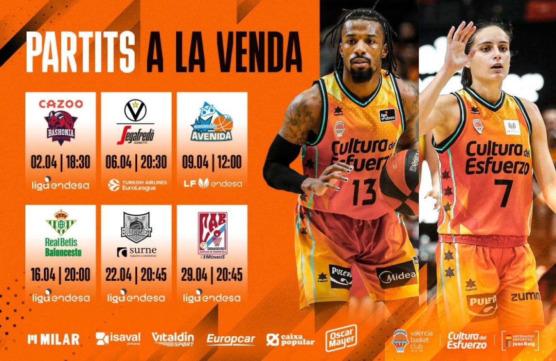 Valencia Basket posa des de les 18h de hui a la venda les entrades dels partits oficials del pròxim mes d'abril. 6 grans partits amb molt en joc encarant la fase decisiva de la temporada! https://valenciabasket.koobin.com/.