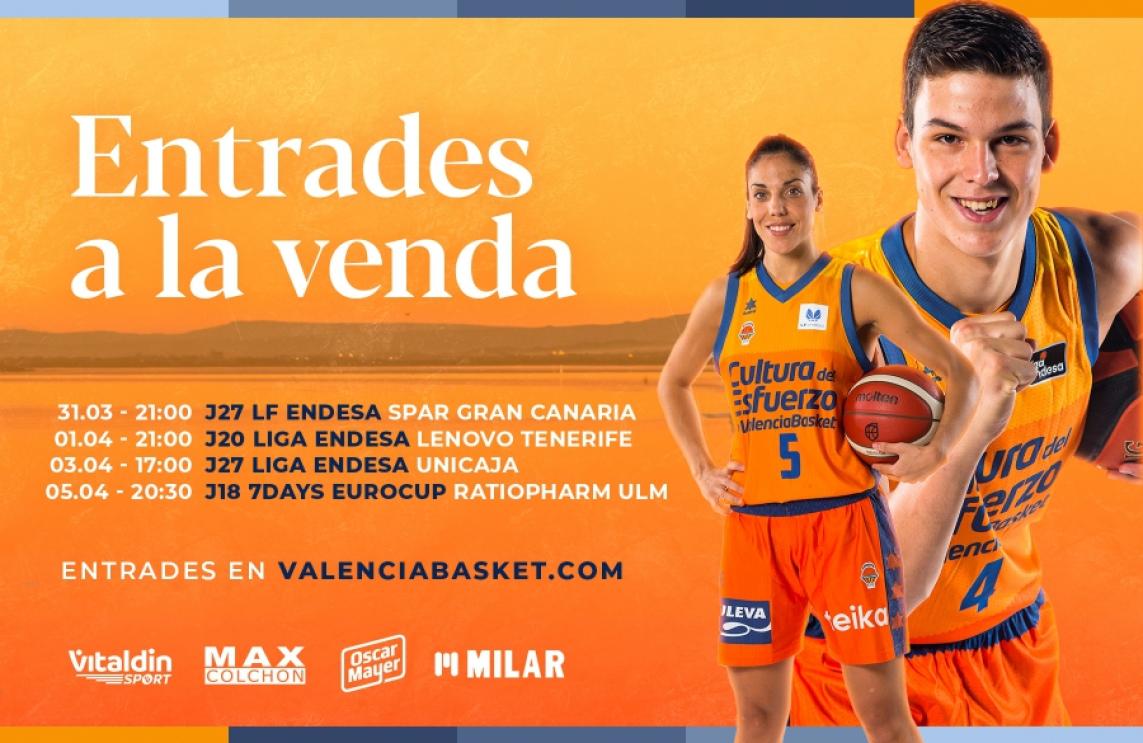 València Basket posa a la venda les entrades per al duel de Lliga Femenina Endesa davant Spar Gran Canària que es disputa a la Fonteta el pròxim 31 de març a les 21h i per als tres primers duels de l'equip masculí a l'abril. El dia 01 l'equip de Joan Peñarroya rebrà a Lenovo Tenerife a les 21h, dos dies més tard, el diumenge 03 d'abril, rebrà a Unicaja de Màlaga a les 17h, mentre que ratiopharm Ulm tancarà el cicle de tres partits en 5 dies, visitant la Fonteta a les 20:30h del dimarts 05 d'abril. En total 4 duels de màxim nivell en menys d'una setmana per a gaudir del bàsquet com mai.