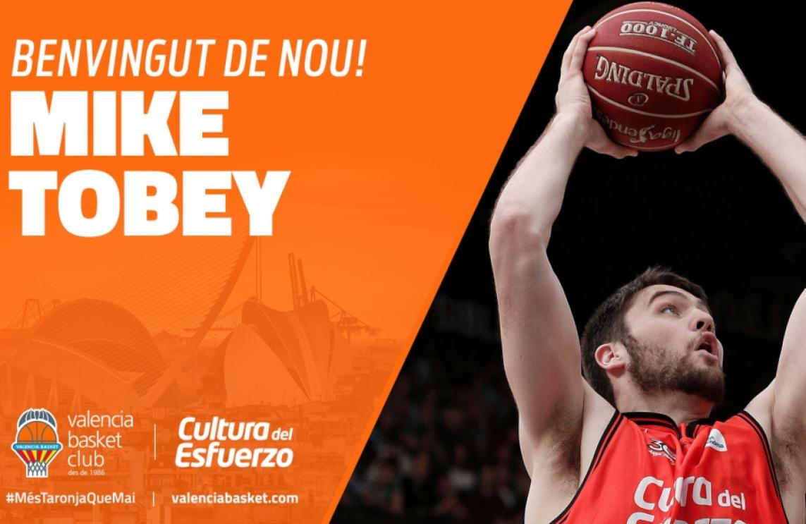 Esta serà la segona etapa de Tobey en el conjunt taronja a què va arribar al març de 2017 fins a final d'una històrica temporada que culminaria amb el títol de la Lliga Endesa. Mike Tobey procedix d'Iberostar Tenerife, equip amb què va amitjanar 11 punts i 7 rebots en Lliga Endesa, i de 13.5 punts i 7 rebots en la Champions League.