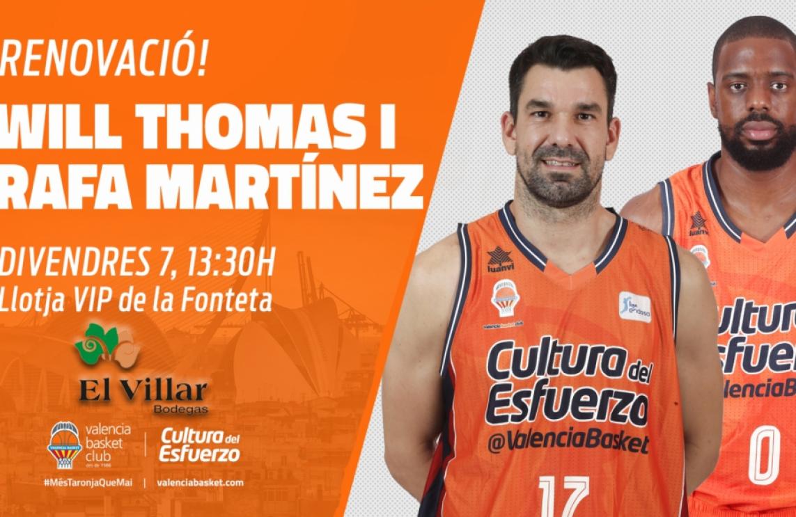 El capitán Rafa Martínez y el ala-pívot  Will Thomas celebrarán sus respectivas renovaciones para la temporada 2018-19 con el Valencia Basket en un acto que tendrá lugar mañana viernes 7 de septiembre a las 13:30 horas en el Palco VIP de la Fonteta y que estará patrocinado por Bodegas El Villar.