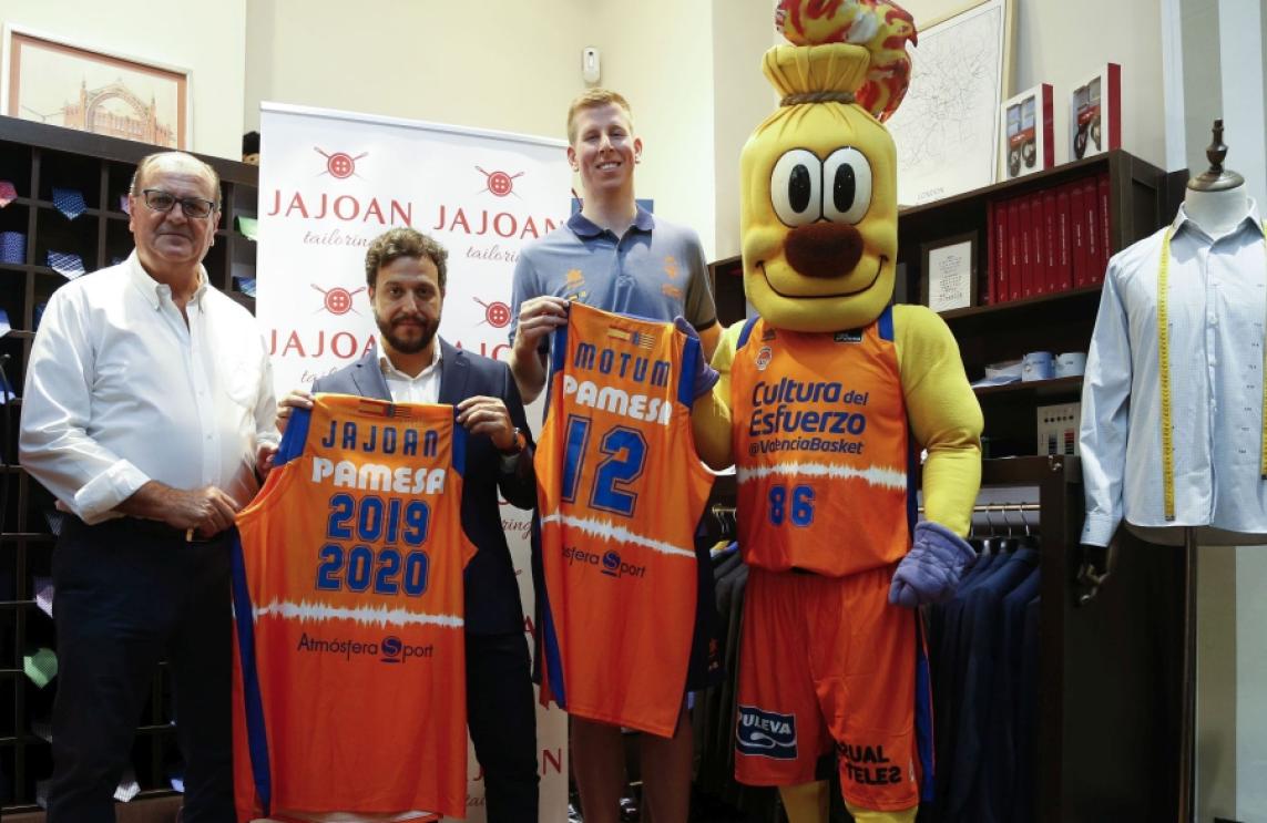 Pedro Berdonces, socio de Sastrería Jajoan, ha ejercido de anfitrión en un acto en el que el nuevo jugador taronja ha estado acompañado por el presidente Vicente Solá en representación del Valencia Basket.