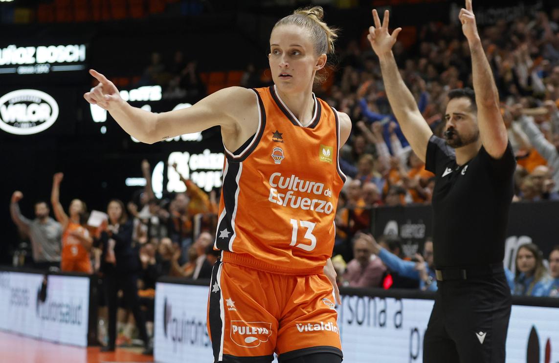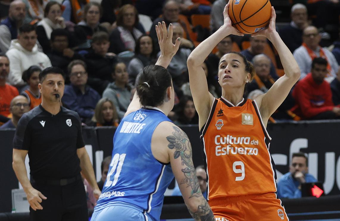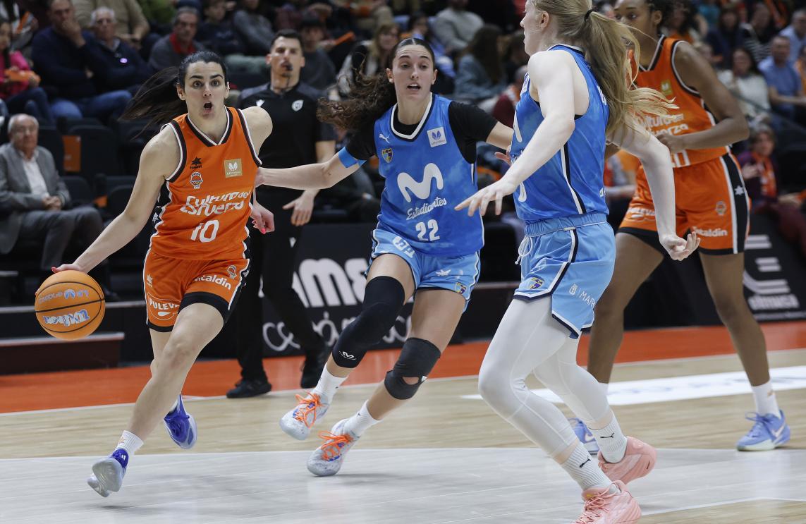 El conjunto taronja saltó a la pista con Leticia Romero, Queralt Casas, Alina Iagupova, Nadia Fingall y Kayla Alexander. Alonso de Armiño estrenaba el partido y Alexander respondía para Valencia Basket. Imprecisiones en los primeros minutos de juego provocaron un primer parcial visitante de 2-9, que ponía una diferencia de 7 puntos. Rubén Burgos pedía tiempo muerto. Movistar Estudiantes lo estaba metiendo absolutamente todo, pese a algunas buenas defensas, aunque había que ajustar más. En ataque, algunas buenas finalizaciones se salían del aro. Una acertada Alonso de Armiño subía a 10 la distancia. Por fortuna, aparecía Iagupova para responder los golpes desde el triple, pero estaba siendo muy complicado frenar la anotación estudiantil. El final de cuarto fue un festival de triples en el que ellas colocaban el +13 y Vitola lo reducía a 10 al final del primer cuarto.