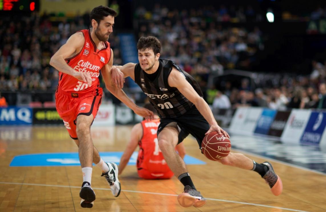 L'entrenador Pedro Martínez va començar el partit posant en pista el quintet format per Sam Van Rossom, Joan Sastre, Fernando San Emeterio, Luke Sikma i Bojan Dubljevic. Una safata en transició de Sastre va ser la primera cistella taronja per a respondre al bon inici dels homes de negre, que van arribar a manar per sis en l'inici. L'activitat defensiva furtant pilotes i cinc punts seguits de Luke Sikma van ficar en el partit a Valencia Basket. L'equip taronja va seguir provocant pèrdues locals i una safata en transició de Fernando San Emeterio va empatar el partit a 10 a quatre minuts del final del primer quart. Un triple de Dubljevic i una safata de San Emeterio van posar el primer avantatge taronja (12-15 min.7) encara que Tabu i Mumbrú van retornar l'avantatge al quadre local. Una pilota penjada per Diot a Pierre Oriola que va acabar en cistella va tallar un parcial de 8-0, encara que un triple de Salgado deixava el marcador en 23-18 al final del primer quart.