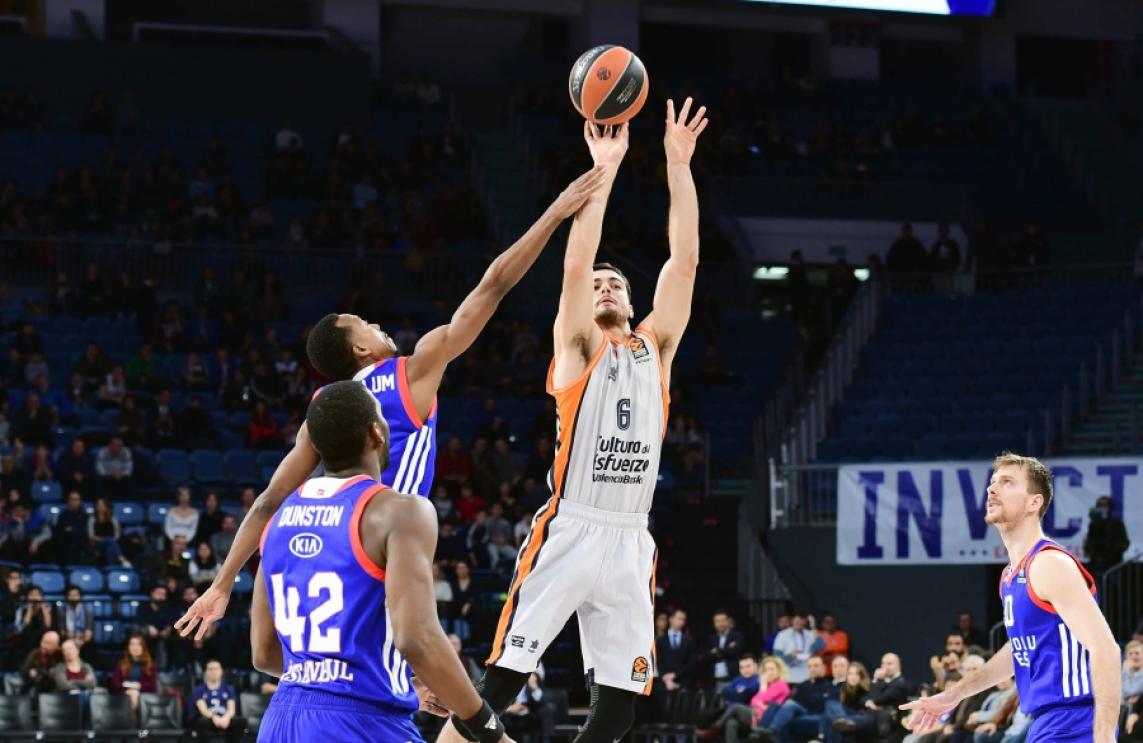 Valencia Basket sufrió una derrota en su visita a la cancha del Anadolu Efes (82-66) en un encuentro en el que se vio lastrado por las siete ausencias por lesión con las que el equipo taronja viajó a Estambul aunque luchó por mantenerse en el partido hasta donde le duraron las fuerzas. El equipo taronja se mantuvo cerca hasta que la irrupción ofensiva de Motum en el final del segundo cuarto le dio al cuadro turco una ventaja que Valencia Basket pudo bajar a cinco ya metidos en el último cuarto con la mejora defensiva y el acierto exterior de Erick Green. Un arreón de McCollum volvió a aumentar la  renta local y un equipo taronja exhausto no pudo llegar al final con opciones. Los 18 puntos de Erick Green y los buenos minutos de Josep Puerto, lo más destacable del partido.
