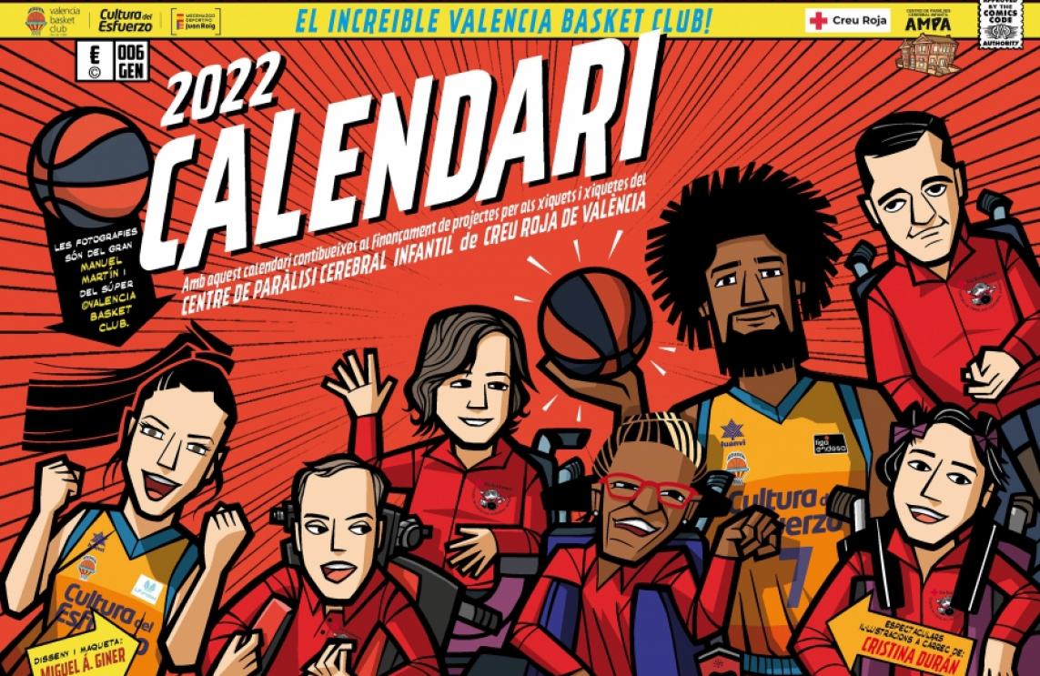 El calendario solidario del año 2022 a beneficio de los niños y niñas del Colegio de Parálisis Cerebral Infantil de Cruz Roja de Valencia, que se ha realizado por octava temporada consecutiva, ya está en la imprenta y estará disponible en los próximos días tanto en las tiendas oficiales del Valencia Basket como en otros puntos de venta.