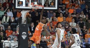 Valencia Basket contuvo la buena salida ofensiva del conjunto blanco con dos tiros libres de Reuvers y una canasta en acción individual de Thompson, pero un triple y un alley-oop de Hezonja le daban la vuelta al marcador muchos minutos después. Thompson encontró a Sako para un alley-oop y Taylor, que siguió al partido pese al dolor, clavó un triple para replicar a un 2+1 de Deck. Tras dos tiros libres de De Larrea, un triple de Maledon y una canasta de Deck llevaban a Pedro Martínez a parar el partido con 65-68 al paso por el minuto 26. De Larrea y un triple de Brancou lo volvían a equilibrar y un espectacular mate de Larry cambiaba momentáneamente el signo de un partido que se movía en diferencias cortas que iban cambiando de dueño, con Maledon y Feliz manteniendo a los suyos en partido. Costello en el poste bajo o un palmeo de Key lo mantenían equilibrado y un triple de Matt lo dejaba en 79-77 con diez minutos por jugar.