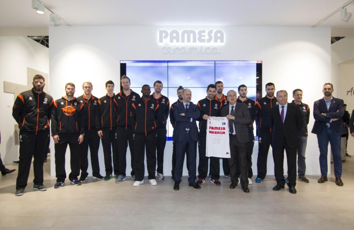El autobús de Valencia Basket ha llegado a Feria Valencia unos minutos después de mediodía y se han dirigido hacia el stand B42 del pabellón 1 en el nivel 3, donde en esta edición de Cevisama se ha instalado el stand  de Pamesa Cerámica. Una vez allí, el presidente del Grupo Industrial Pamesa, Fernando Roig, y el director general del Grupo Pamesa, Jorge Bauset, han recibido a la expedición taronja. El capitán de Valencia Basket, Rafa Martínez, le ha hecho entrega a Fernando Roig de una camiseta conmemorativa de los 1.000 partidos ACB con su nombre y con el número 88, representativo de la primera temporada del equipo en la élite.