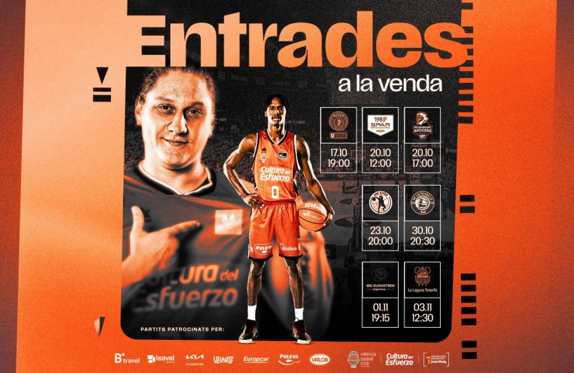 Valencia Basket pondrá a la venta hoy a las 18h de la tarde las entradas para un total de 7 partidos más en la Fonteta, cuatro masculinos y tres femeninos, que se unirán al partido femenino de este miércoles ante ZVVZ USK Praha. Desde esta tarde se podrán adquirir localidades para esos encuentros en la web del Club a través de este enlace: https://valenciabasket.koobin.com/
