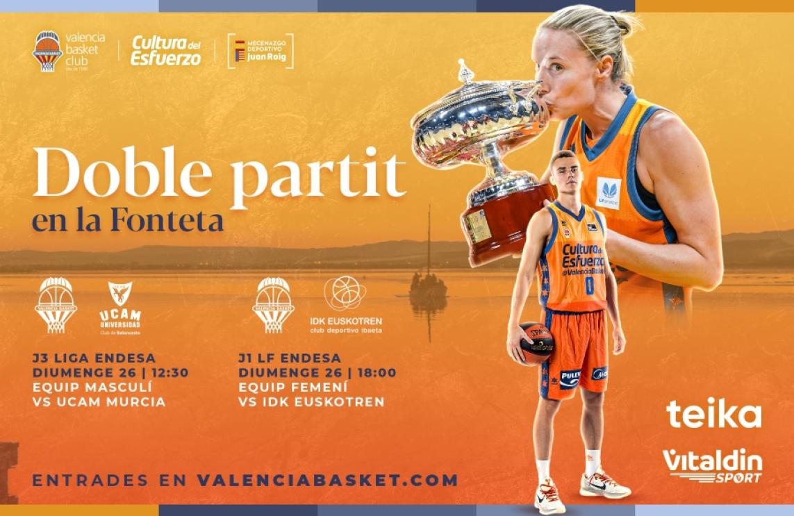 Valencia Basket posa a la venda des de demà dimecres 22 de setembre a les 9:30h i de forma exclusivament en línia, les entrades disponibles per als dos partits que les nostres plantilles professionals disputaran a la Fonteta el diumenge 26 de setembre. Obrirà la jornada el primer equip masculí, que es mesurarà al UCAM Múrcia a les 12:30 hores en partit corresponent a la jornada 3 de la Liga Endesa. Les entrades per a este encontre estaran disponibles des de 10 euros. Posteriorment, les supercampiones d'Espanya obriran la seua participació en la Liga Femenina Endesa rebent al IDK Euskotren en un partit que es jugarà a les 18:00 hores i amb entrades a la venda des de 6 euros.