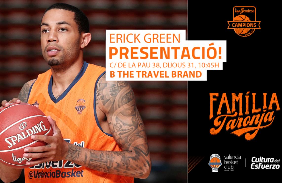 L'escorta nord-americà Erick Green (1.90m, Inglewood, Califòrnia, 09/05/1991, 26 anys) serà presentat com a nou jugador de Valencia Basket en un acte que tindrà lloc demà dijous 31 d'agost a les 10:45 hores en l'agència que B The Travel Brand té en el número 38 del Carrer de la Pau, a València.