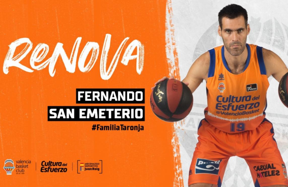 El alero internacional español Fernando San Emeterio y Valencia Basket han alcanzado un acuerdo para que el jugador cántabro (1,99m, Santander, 01/1/1984, 36 años) alargue su vínculo con el Club por una temporada más, hasta el 30 de junio de 2021, con una segunda temporada opcional.