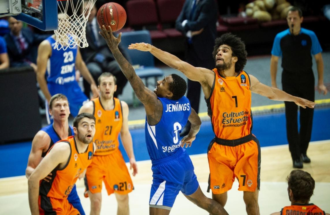 Jaume Ponsarnau va començar el partit amb el quintet format per Sam Van Rossom, Matt Thomas, Aaron Doornekamp, Louis Labeyrie i Mike Tobey. L'equip taronja va començar amb un parcial d'eixida de 0-6 amb punts de Van Rossom, Matt i Tobey i malgrat la cistella de Jennings, Labeyrie des del tir lliure i Matt des de la mitja distància van posar el 2-10. Reynolds i Simonovic van activar l'ofensiva russa i Voronov amb un triple des de la cantonada va posar a un al quadre local. Tobey va trencar el parcial del Zenit amb dues cistelles seguides baix l’anella (9-14 min.6) i Sergi García va contestar al triple de Jennings. Abalde després de robatori i el segon triple de Sergi García col·locaven el 14-22 abans d'un altre triple, en este cas obra de Karasev. Però Dubljevic va respondre al triple i una cistella de Mekel ho deixava en 19-25 en finalitzar el primer quart.