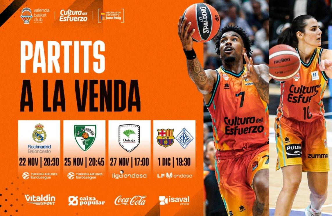 Valencia Basket is putting tickets for the next official matches on sale from 6pm today until December 1st. Two duels of the highest European men's competition, and two domestic matches, one for men and one for women, are now available through the following link: https://valenciabasket.koobin.com/.