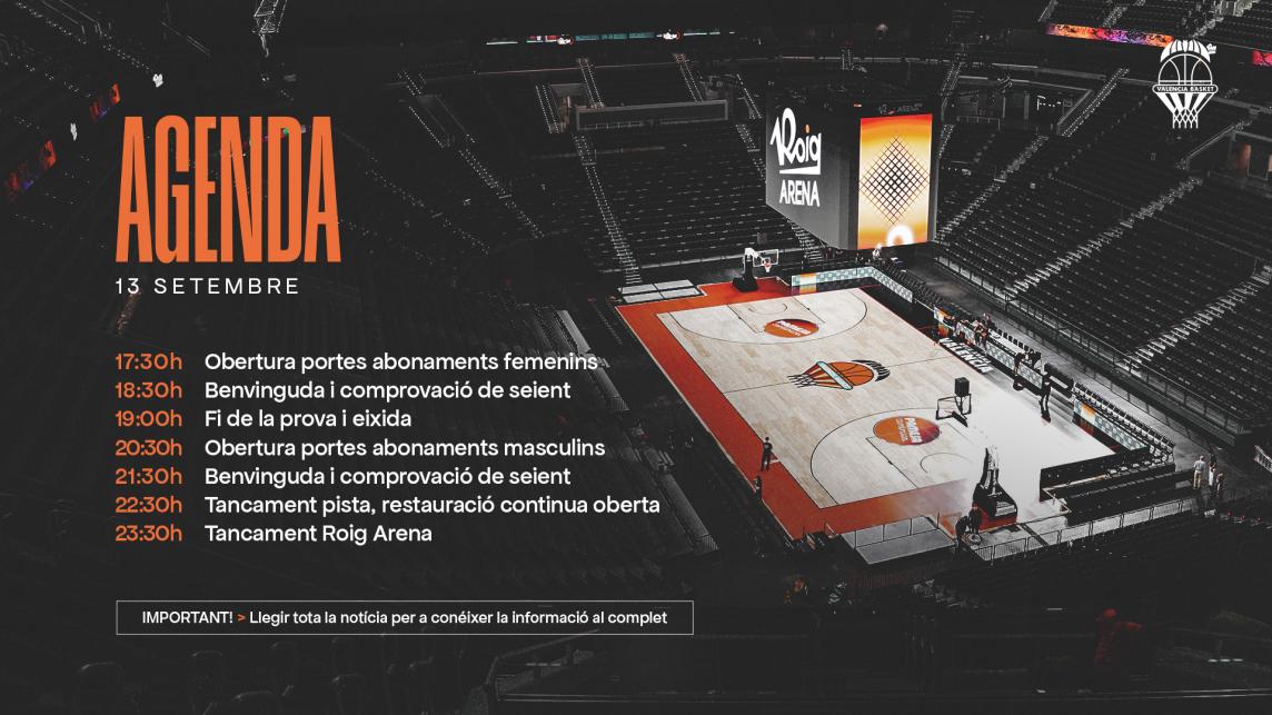 Valencia Basket llevará a cabo el próximo sábado 13 de septiembre por la tarde una prueba de accesos en su nueva casa, el Roig Arena, de forma que todos los abonados taronja que lo deseen tendrán acceso a ver in situ el que será su asiento durante la próxima temporada. Tanto abonos masculinos como femeninos tendrán la opción de probar su localidad. Esta prueba servirá también para poner a prueba los flujos y accesos y poder mejorar de esta manera de cara a los primeros partidos. Los horarios de la jornada serán los siguientes: