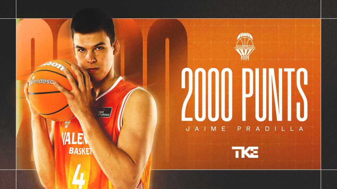 El ala-pívot Jaime Pradilla se convirtió anoche con los siete puntos anotados en el triunfo ante el Paris Basketball en el decimoquinto jugador de nuestro primer equipo masculino que rebasa la frontera de los 2000 puntos. En concreto, el interior internacional español ha anotado 2001 puntos en los 343 partidos en los que hasta el momento ha defendido la elástica taronja.