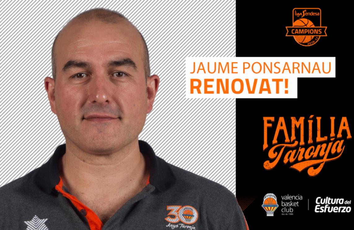 Jaume Ponsarnau i Valencia Basket han aconseguit un acord perquè l'entrenador ilerdenc (28/04/1971, 46 anys) renove la seua vinculació amb l'equip taronja durant les tres pròximes temporades, fins al 30 de juny de 2020. Ponsarnau va arribar al Club en l'estiu de 2016 per a formar part del cos tècnic de l'equip campió de la Liga Endesa.