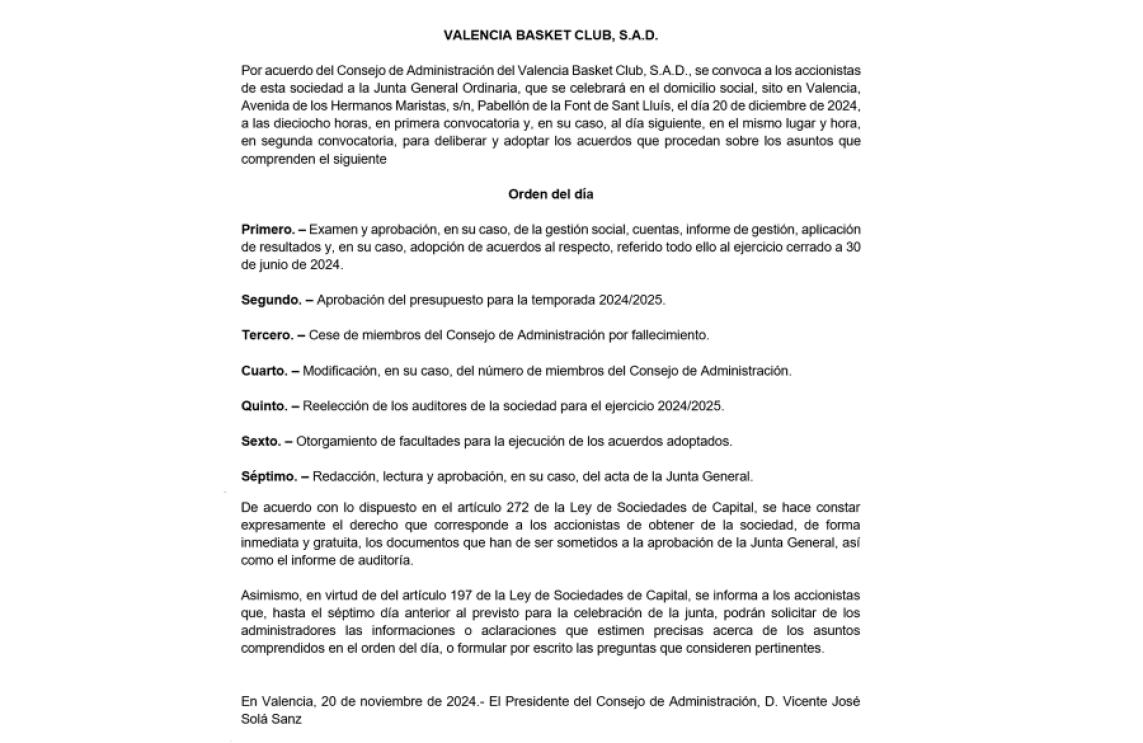 Por acuerdo del Consejo de Administración del Valencia Basket Club, S.A.D., se convoca a los accionistas de esta sociedad a la Junta General Ordinaria, que se celebrará en el domicilio social, sito en Valencia, Avenida de los Hermanos Maristas, s/n, Pabellón de la Font de Sant Lluís, el día 20 de diciembre de 2024, a las dieciocho horas, en primera convocatoria y, en su caso, al día siguiente, en el mismo lugar y hora, en segunda convocatoria, para deliberar y adoptar los acuerdos que procedan sobre los asuntos que comprenden el siguiente