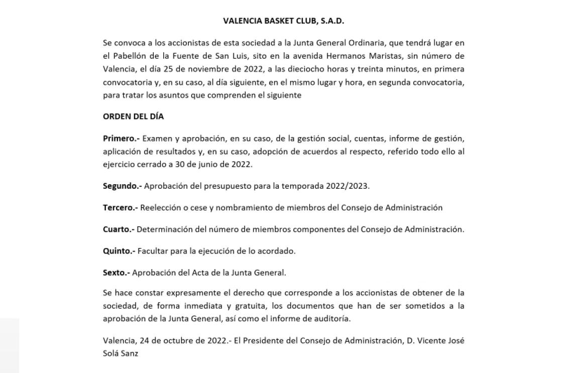 Se convoca a los accionistas de esta sociedad a la Junta General Ordinaria, que tendrá lugar en el Pabellón de la Fuente de San Luis, sito en la avenida Hermanos Maristas, sin número de Valencia, el día 25 de noviembre de 2022, a las dieciocho horas y treinta minutos, en primera convocatoria y, en su caso, al día siguiente, en el mismo lugar y hora, en segunda convocatoria, para tratar los asuntos que comprenden el siguiente