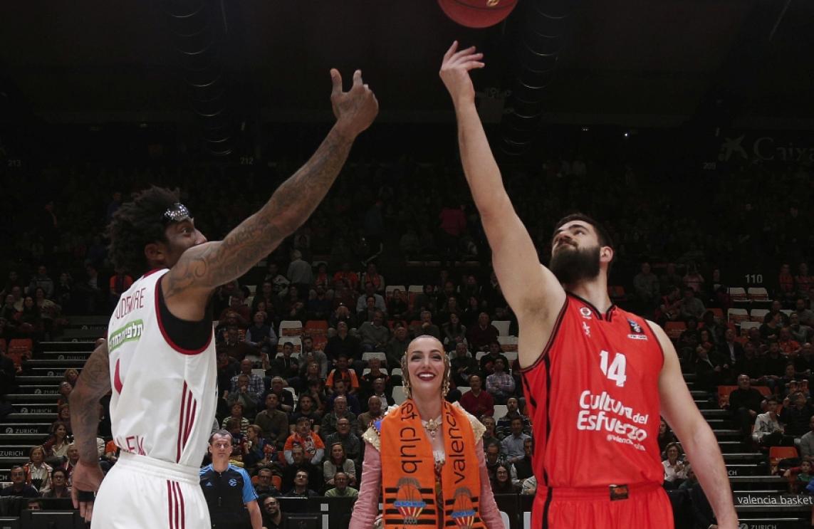 Raquel Alario, Fallera Major de València, ha realitzat esta nit la treta d'honor abans de l'inici del primer partit de les semifinals de la 7DAYS Eurocup que ha acabat amb victòria del Valencia Basket sobre el Hapoel Bank Yahav Jerusalem. Raquel, que ha estat acompanyada per tota la seua Cort d'Honor, ha llançat de manera simbòlica la pilota a l'aire en el cercle central de la Fonteta entre Bojan Dubljevic i Amar’e Stoudemire.