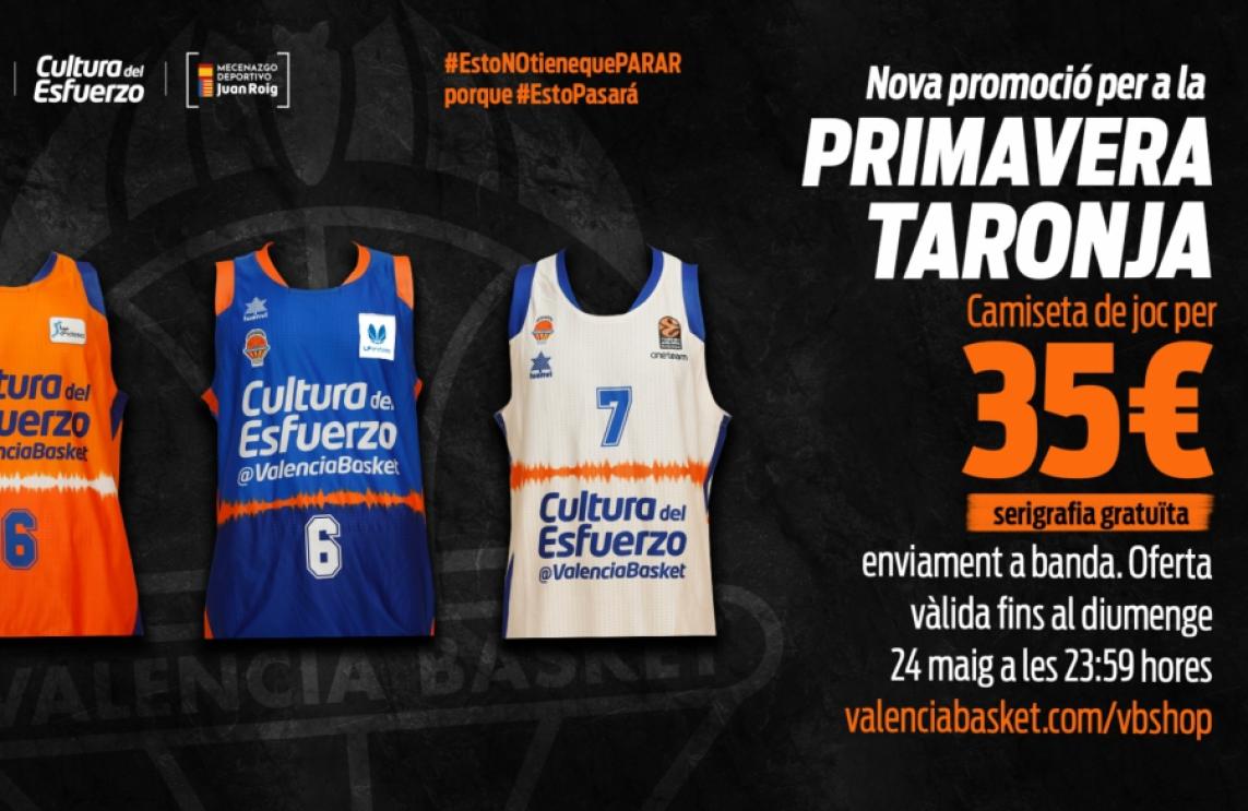 A més, des de hui i fins a aquest diumenge a les 23.59 hores, les camisetes oficials de joc del Valencia Basket estaran disponibles a un preu especial de 35 euros, amb la possibilitat d'afegir-los la serigrafia de forma totalment gratuïta. Aquesta oferta estarà disponible tant a la botiga on-line (a la qual pots accedir punxant en aquest enllaç) com a les botigues físiques.