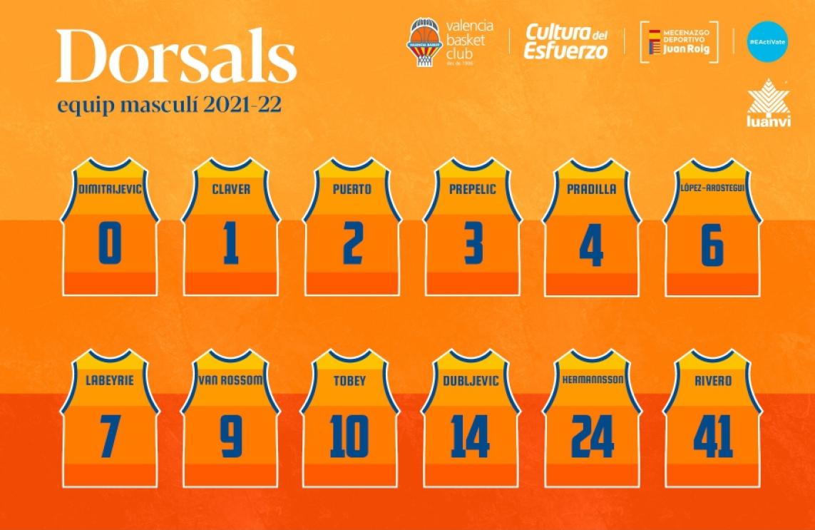 Entre las nuevas incorporaciones el citado Xabi López-Arostegui y el base Nenad Dimitrijevic (que mantiene el dorsal 0 con el que ha jugado toda su trayectoria profesional con el Club Joventut Badalona) han podido elegir su número preferido. El alero Víctor Claver ha encontrado ocupado el número 9 con el que jugó su primera etapa como taronja y en esta ocasión ha optado por colocarse el #1 en su camiseta del Valencia Basket. Mientras que el ala-pívot Jasiel Rivero ha dado la vuelta a su tradicional 14 (que en nuestro equipo masculino es propiedad de Dubljevic) y jugará con la camiseta número 41.