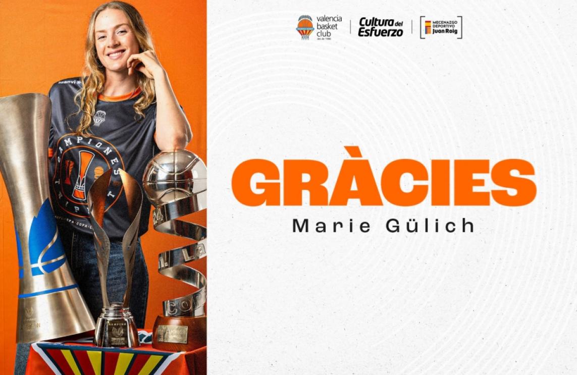 Valencia Basket quiere agradecer a Marie Gülich su entrega, dedicación, trabajo y profesionalidad durante los cuatro años en los que ha llevado la camiseta taronja. Una etapa en la que se ha convertido en pieza clave del proyecto y ha dejado huella tanto en la afición como en el vestuario. Su paso por el club termina tras concluir su contrato, pero la pívot alemana se ha reservado un lugar especial en todos los corazones taronja.