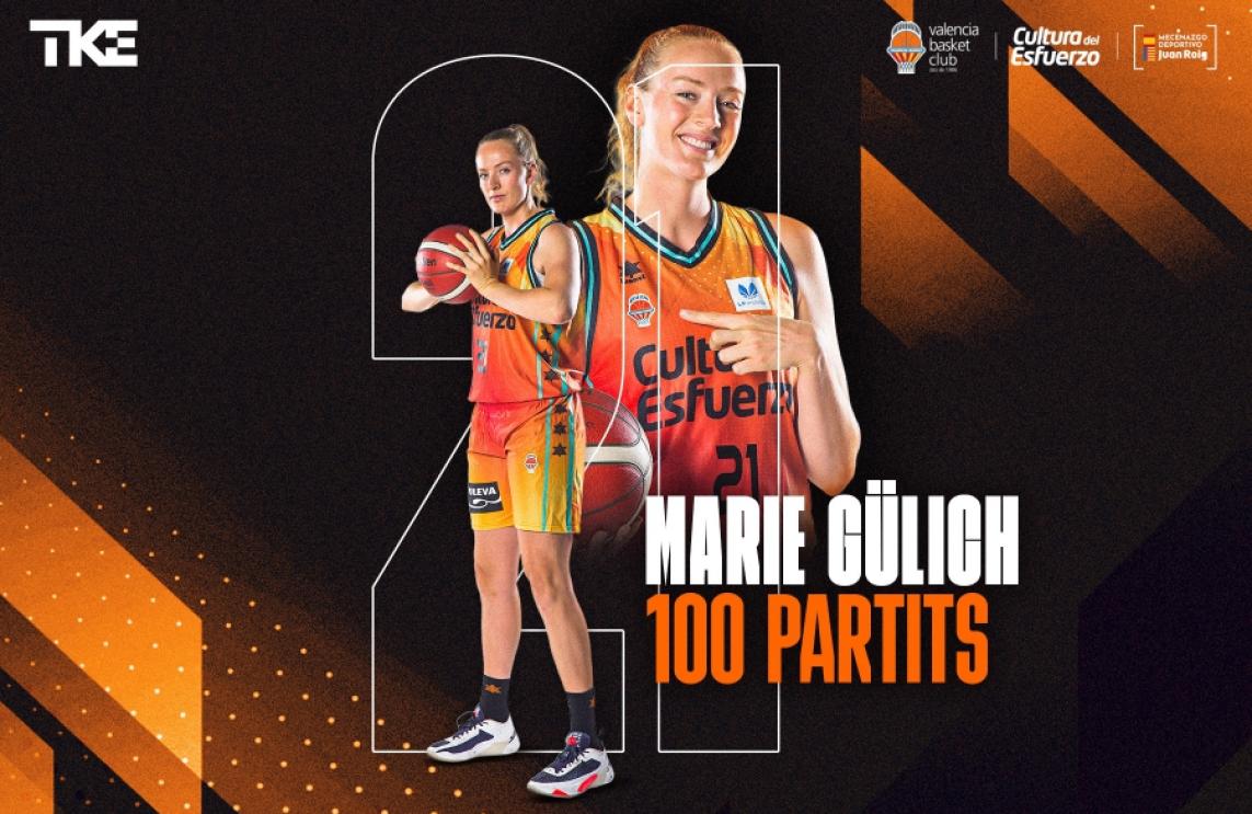 Marie Gülich hace historia, un día más, con Valencia Basket. En poco más de dos temporadas la interior ya ha llegado a la cifra de 100 partidos con la camiseta taronja. Es la séptima jugadora de la sección femenina en alcanzar los tres dígitos.