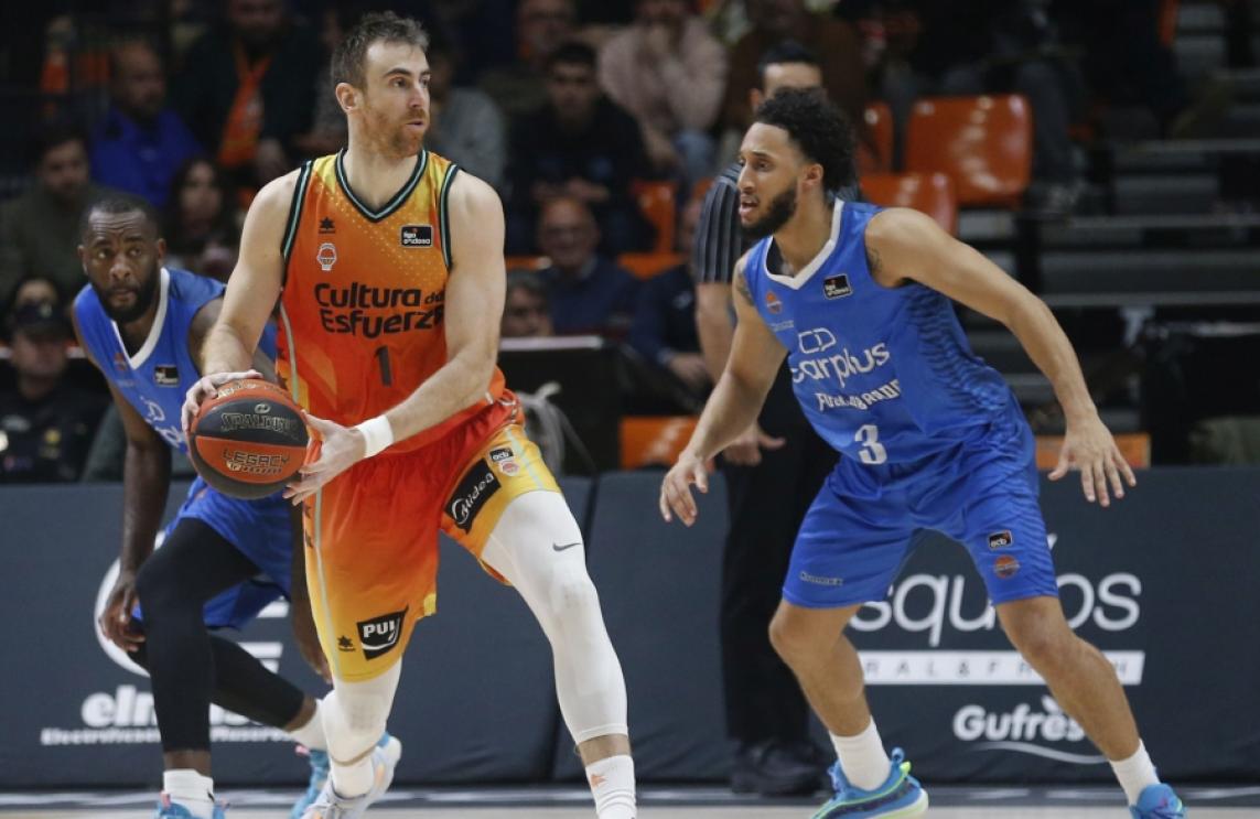 El alero de Valencia Basket Víctor Claver tuvo que retirarse del partido el triunfo de ayer frente al Carplus Fuenlabrada tras recibir un fuerte golpe en las costillas.
