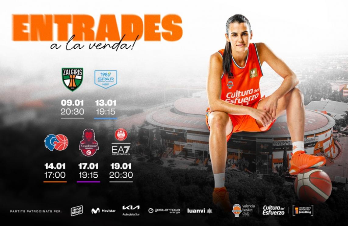Valencia Basket posa ja a la venda les entrades dels partits fins al 19 de gener que afronten els equips professionals. 5 nous partits passen a estar disponibles en la web del Club a través d'aquest enllaç: https://valenciabasket.koobin.com/.