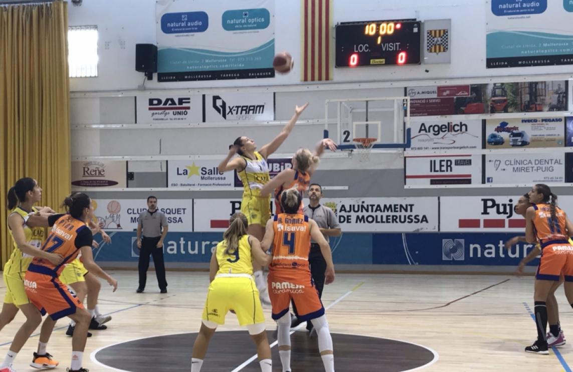 Van començar millor les locals, que amb només 4 jugadores anotant durant els dos primers quarts, aconseguien mantindre controlat al seu rival. Etxarri i Bahi, amb 11 i 9 punts cada una, secundades per Pujol i Nogic, posaven contra les cordes a la defensa taronja, que tenia dificultats per a trobar solució. La parella Tamara-Meiya en el joc interior taronja i 4 punts de Marina Lizarazu i Irene Garí, sostenien a les visitants, que al descans es quedaven a 6 punts de l'equip català (29-23).