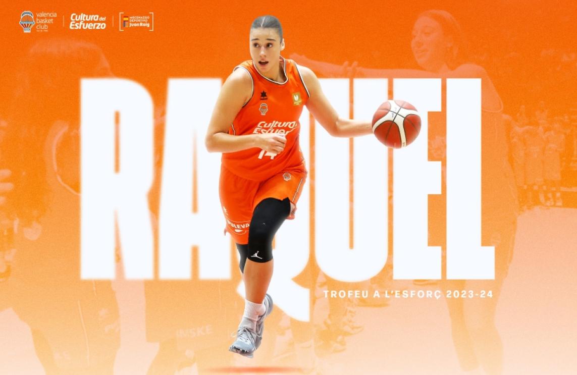 La jugadora del Valencia Basket Raquel Carrera es la ganadora del Trofeo al Esfuerzo de la temporada 23-24, galardón que ofrece la afición taronja votando durante la fase regular de la competición tras cada partido a través de la web. Esta es la quinta edición que se realiza con el equipo femenino y la Familia Taronja ha querido recompensar este año a la jugadora gallega por su entrega en cada partido, representando a la perfección los valores del Club.
