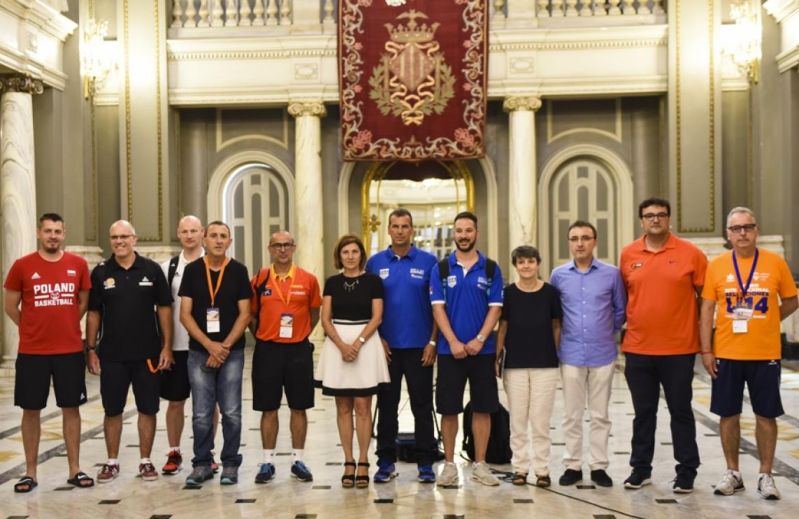 La regidora d'esports de l'Ajuntament de València, Mayte Girau, ha rebut este matí en el Saló de Cristall del consistori de la capital valenciana als representants de les cinc federacions nacionals que participen en el Torneig masculí BAM L’Alqueria del Basket 2018 (Grècia, Polònia, Israel, Ucraïna i Espanya, que participa amb dos equips).