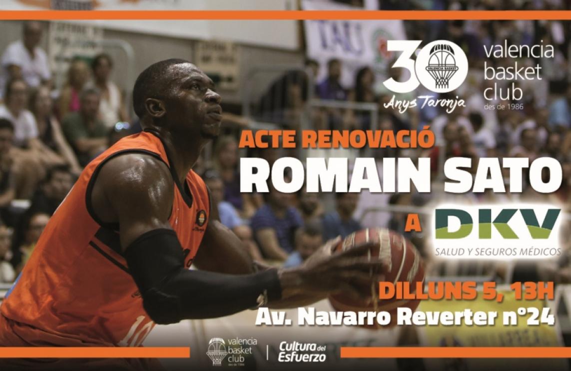 Valencia Basket escenificarà l'acord aconseguit amb l’aler Romain Sato perquè continue en el Club en la que serà la seua quarta temporada com a taronja en un acte que tindrà lloc demà dilluns 5 de setembre a les 13:00 hores en la sucursal que DKV té en el número 24 de l'Avinguda Navarro Reverter de València.