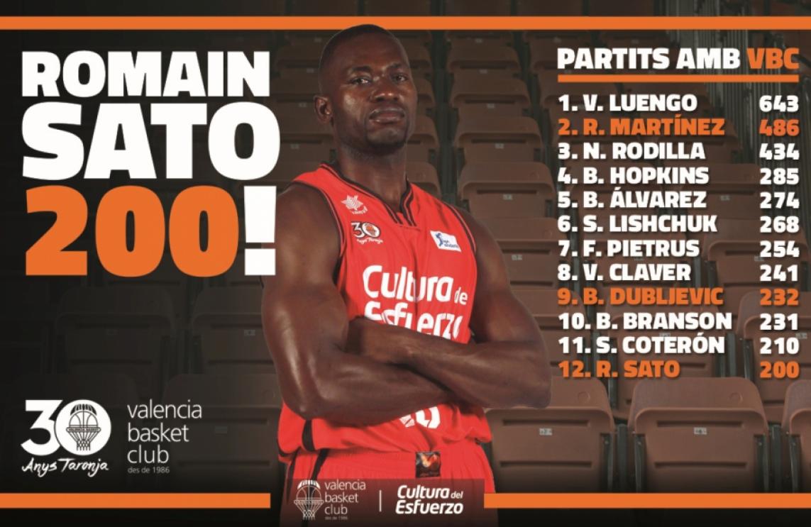 Tan sólo 12 jugadores en la historia de Valencia Basket han sido capaces de vestir nuestra camiseta en 200 partidos oficiales. La lista la engrosó el pasado martes Romain Sato, que en su cuarto año en el club sigue escribiendo su nombre con letras importantes.