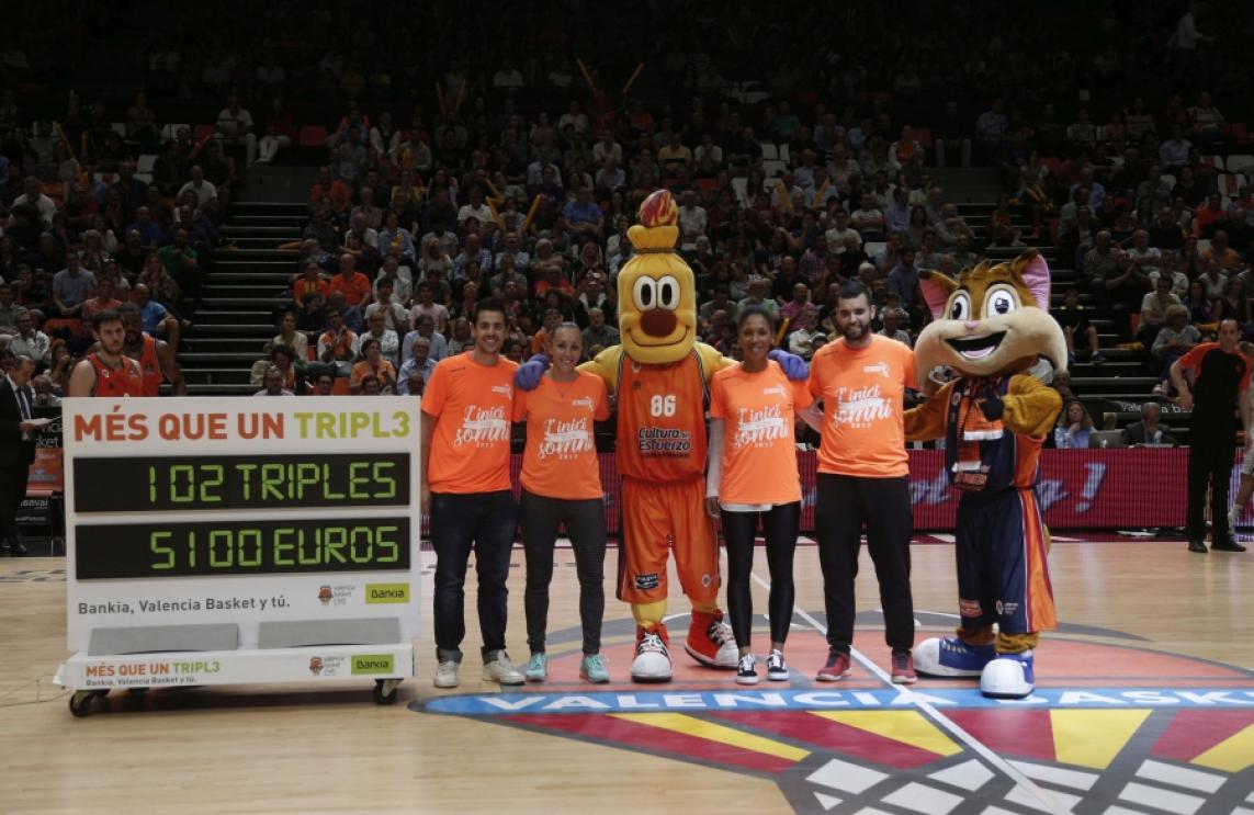 Durant tota la temporada, per cada triple que anote el Valencia Basket, Bankia donarà 50 euros a la Fundació Valencia Bàsquet 2000 per a la formació d'entrenadors d'escola i planter de la Fundació del VBC. Les edicions especials del ‘Triple Solidari’ de Bankia doblen el premi, però també la dificultat. En la primera edició d'este curs, la montenegrina Snezana Aleksic va estar especialment afinada i va anotar dos llançaments des de la línia divisòria, que units a un altre encert d'un dels espectadors, van aportar tres triples de doble valor al Marcador Solidari. El repte consistix que els nous participants aconseguisquen encistellar des del mig camp en el descans entre el tercer i l'últim quart del partit davant el MoraBanc Andorra i, en eixe cas, l'aportació de Bankia es tornarà a doblar fins a arribar als 100 euros per cadascun dels triples anotats per qualsevol dels cinc contendents en esta nova edició del ‘Triple Solidari’.