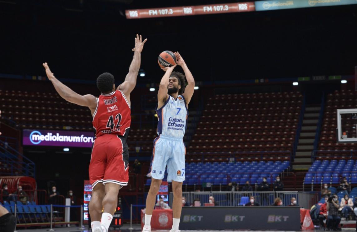 Valencia Basket cayó en la pista del AX Armani Exchange Milán por 95-80 en un encuentro en el que tras un primer cuarto igualado, el acierto de los italianos desde el triple (10/13 en la primera mitad) propició un parcial de 19-2 que le hizo ir a remolque todo el resto del encuentro. La mejora defensiva en la segunda mitad, especialmente en el inicio del último cuarto, permitió a los hombres de Ponsarnau bajar su desventaja de los 24 hasta los 7 puntos a siete minutos del final pero el cuadro italiano volvió a encontrar el acierto de sus exteriores y Datome para abortar la reacción visitante y acabar ganando con autoridad. Derrick Williams con 17 puntos y Nikola Kalinic con 15 fueron los mejores en el lado taronja.