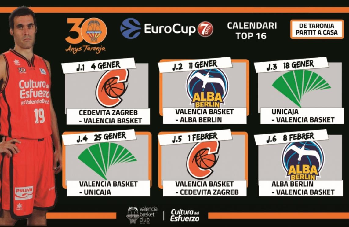 Valencia Basket already knows the calendar of the Top 16 of the 7Days Eurocup. The Taronja team will share the Top 16 Group H with KK Cedevita from Croatian Zagreb (second from Group A); The Alba German Berlin (third of group B) and the Spanish Unicaja (fourth classified of group C)