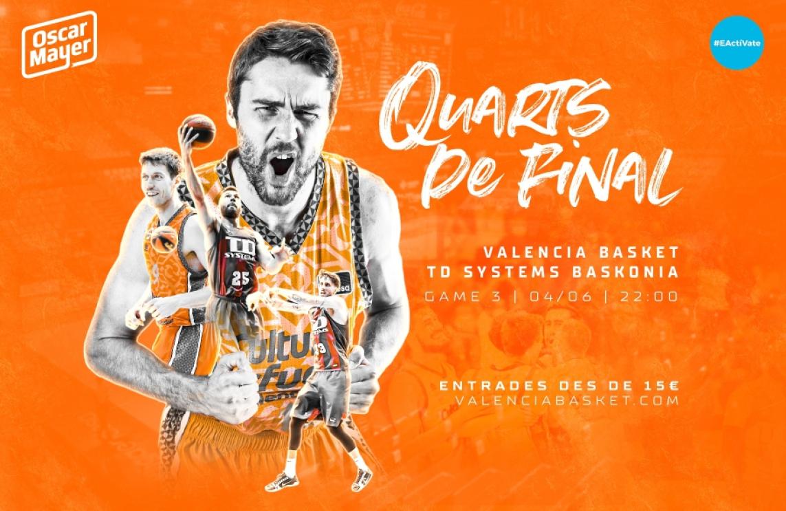 From this moment on, Valencia Basket will be offering 1,355 tickets for sale exclusively online for the third game of the Endesa League Playoff quarter-final tie that will measure our professional men's team with TD Systems Baskonia (Friday June 4, 7:45 pm or 10pm, to be confirmed) with a price ranging from 15 euros in the bottom tier to 50 euros in the side and central stands of the pavilion.