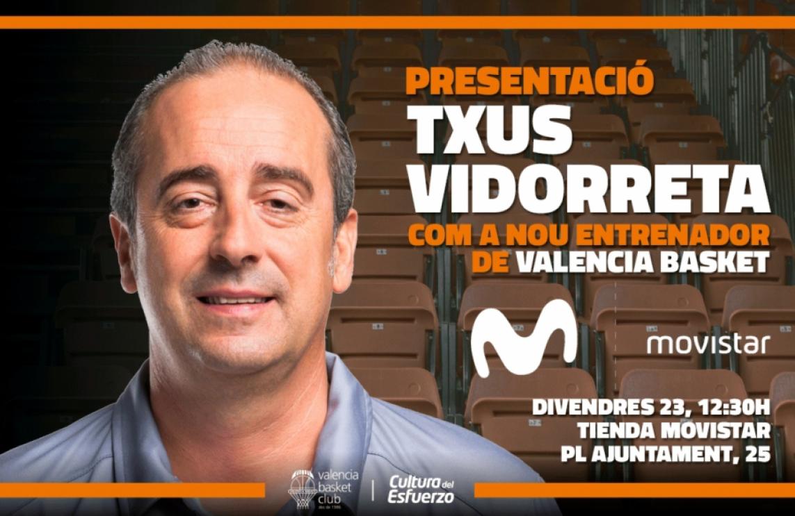 Txus Vidorreta serà presentat com a nou entrenador del Valencia Basket per a la pròxima temporada demà divendres 23 de juny a les 12:30 hores en la Movistar Store situada en el número 25 de la Plaça de l'Ajuntament de València.