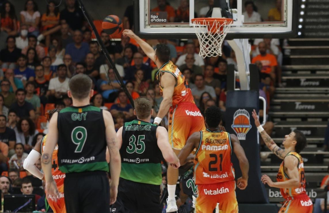 El entrenador Álex Mumbrú comenzó el partido con el quinteto formado por Chris Jones, Klemen Prepelic, Víctor Claver, Jaime Pradilla y Bojan Dubljevic en el día en el que se convertía en centenario como técnico en la Liga Endesa. Dos tiros libres de Pradilla contestaron a la canasta inicial de Guy y Jones anotó antes que Tomic pero una canasta en transición de Prepelic, un acierto a tabla de Dubljevic y un tiro libre del esloveno dieron una primera renta al equipo taronja antes de un triple de Guy. Un palmeo de Xabi lo dejaba en 11-7 al llegar a la mitad del primer cuarto antes de que Tomic y Guy lo empataran. Claver metió el primer triple taronja pero Guy le contestó con otro y luego contestó desde el tiro libre al palmeo de Rivero. Feliz desde la línea de personal puso por encima a los verd-i-negres con el 16-18 antes de dos triples seguidos de Radebaugh y Harper y un tiro libre del base norteamericano para llegar al final del primer cuarto con 23-18.