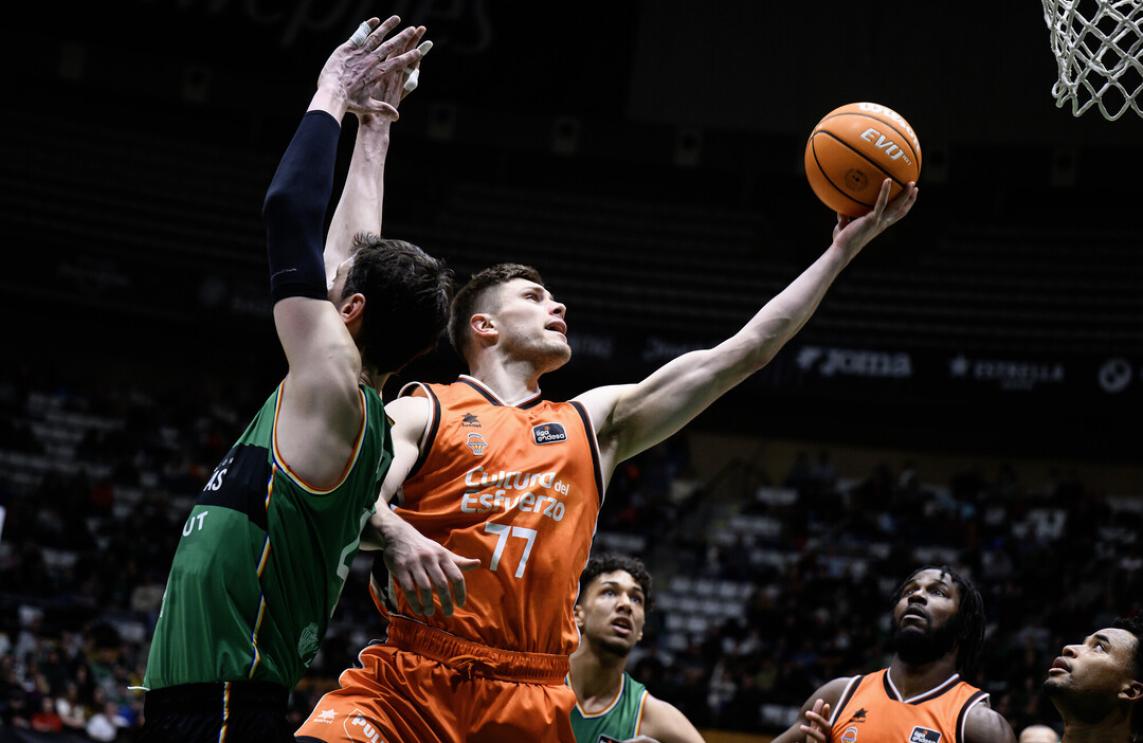 Dotson va ficar la primera de la segona meitat però un triple i dos tirs lliures de Ojeleye estiraven l'avantatge taronja abans d'un triple de Dotson que Costello li va retornar i un palmeig del propi Semi que posava la renda per primera vegada per damunt de la desena i portava a Miret a parar el partit. Tot i el temps mort, Ojeleye va trobar a Reuvers per al mat i Sestina va clavar el triple abans que Pustovyi posara el 51-65 en arribar a la meitat del tercer quart. Jovic es va fabricar el passadís cap a l’anella per dues vegades però un triple de Vives va activar l'ofensiva local i Pustovyi treia viatges al tir lliure per a almenys retornar els colps i no deixar créixer més l'avantatge valencià. Montero i Badio van trobar el camí a l’anella per a sengles safates i un triple de Puerto després de recuperació feia créixer la ferida fins a la vintena i obligava a Miret a tornar a parar el partit al pas pel minut 28. Tomic i un triple de Dekker van obrir un arreó local per a retallar i arribar amb 63-79 amb deu minuts per jugar.