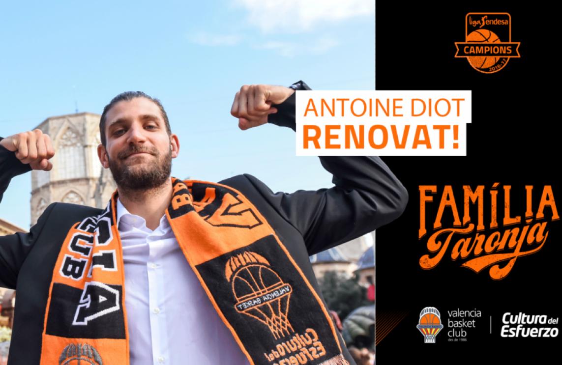 València Basket ha aconseguit un acord amb Antoine Diot per a prorrogar el contracte del base francés amb l'equip taronja fins al 30 de juny de 2019. El base de Bourg-En-Bresse va arribar al Club procedent de l'Estrasburg en l'estiu de 2015, per la qual cosa la pròxima campanya començarà el seu tercer curs com taronja.