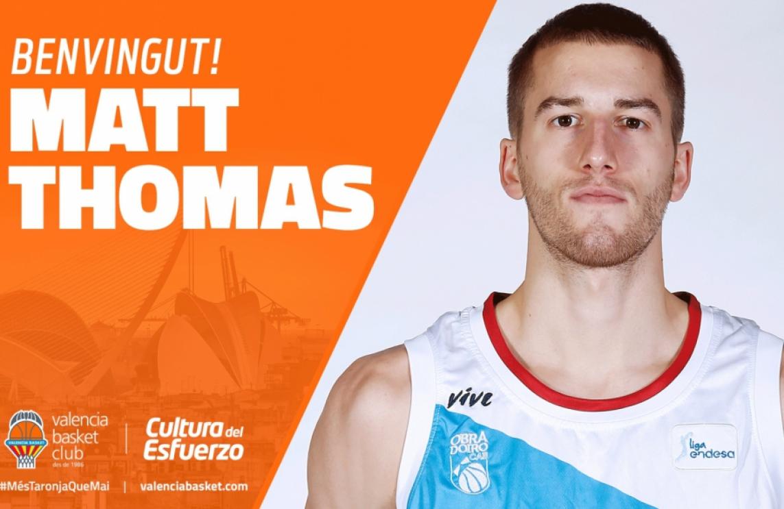 Valencia Basket ha arribat a un acord amb l'escorta nord-americà Matt Thomas (1.96m, Decatur (Illinois), 04/08/1994, 23 anys), que s'incorporarà a la disciplina taronja per a les dos pròximes temporades, fins al 30 de juny de 2020. El jugador es va desvincular del seu equip anterior, el Monbus Obradoiro, després de fer efectiva la seua clàusula d'eixida.