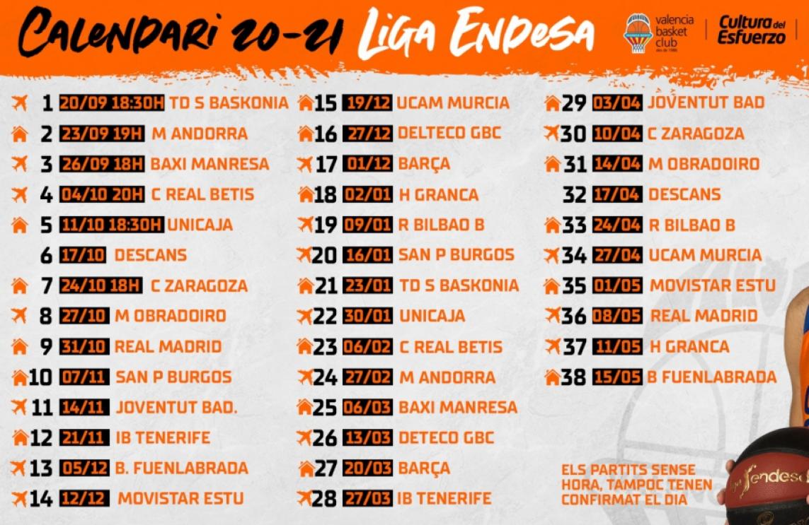 CALENDARIO LIGA ENDESA 2020-21 VALENCIA BASKET