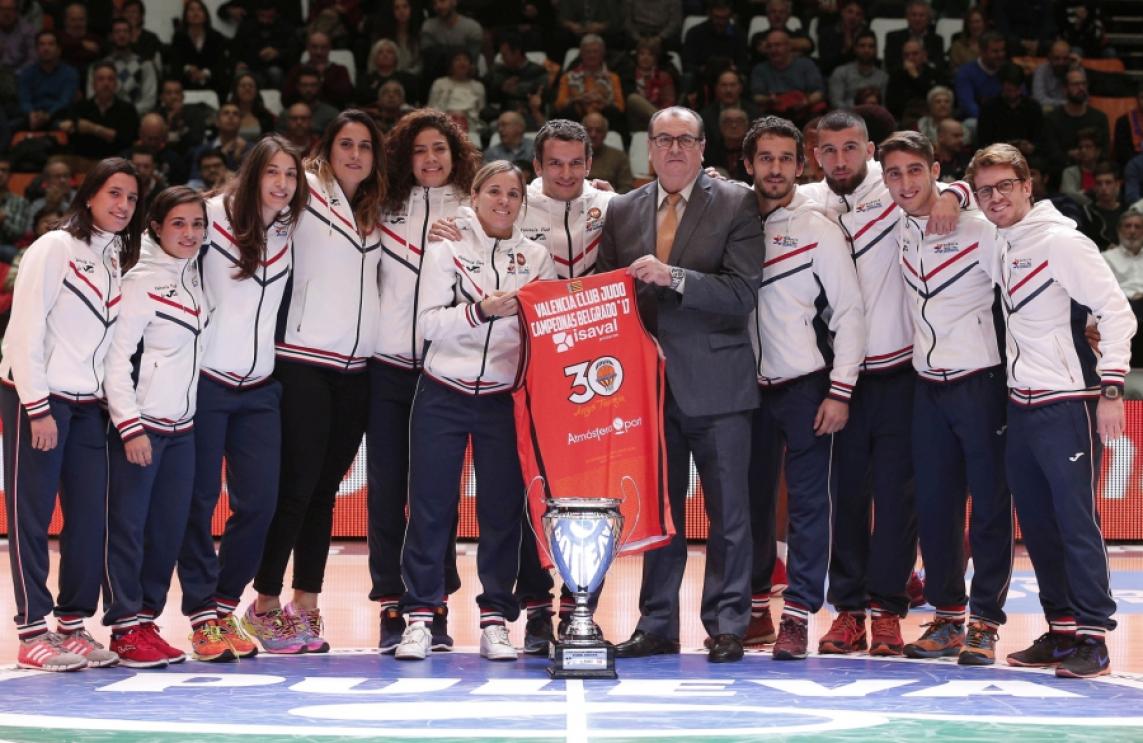 El president de Valencia Basket, Vicente Solá, li ha entregar una camiseta commemorativa amb el lema “Valencia Club Judo Campeonas Belgrado 17” a l'entrenador del València Club de Judo, Xavi Selma. El tribut ha comptat amb la presència tant de l'equip femení campió, format per Ana Pérez, Julia Figueroa, Laura Gómez, Isabel Puche i Anriquelis Barrios; així com dels seus companys de l'equip masculí: Sugoi Uriarte, Gar Uriarte, Shalva Kalabegashvili i Alberto Varela.