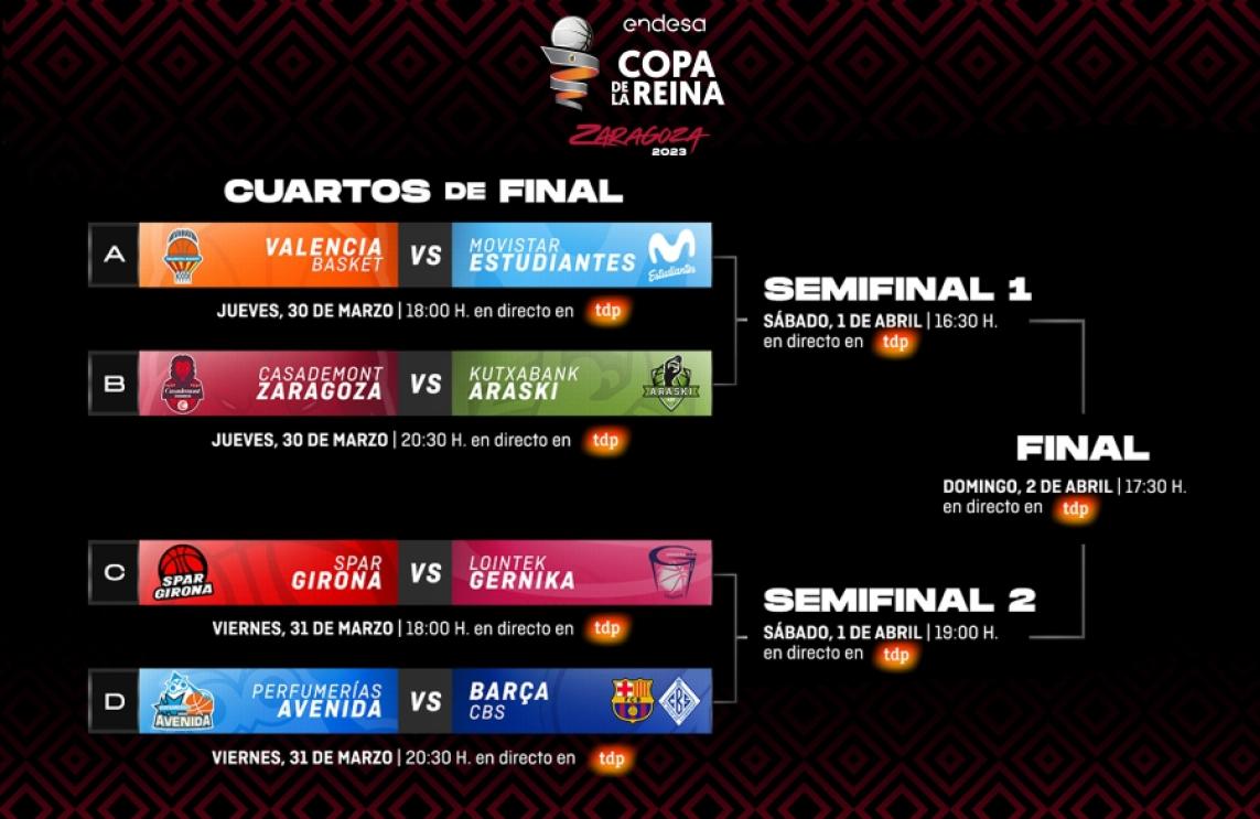 L'equip taronja es mesuraria en cas de victòria al guanyador de l'eliminatòria entre Casademont Zaragoza i Kutxabank Araski, en una hipotètica semifinal que es disputaria el dissabte 1 d'abril a les 16:30h. Spar Girona – Lointek Guernica i Perfumeries Avinguda – Barça CBS seran els altres dos quarts de final dels quals eixirà un finalista, que en cas d’arribar Valencia Basket a la final, es mesuraria a les taronja el diumenge 2 d'abril a les 17:30h. Els partits es retransmetran per Teledeporte i Aragó Televisió.