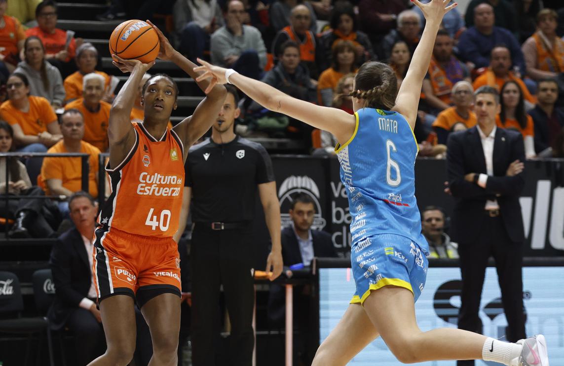 La defensa en el inicio del segundo cuarto subió a otro nivel. Tres minutos en los que Valencia Basket golpeó con un 8-0 liderado por una providencial Turner, que hizo magia con el balón para subir a 20 puntos la ventaja. El técnico visitante volvía a parar el partido, pero no obtuvo la reacción esperada. La sangría taronja llegaba a un balance astronómico de 24-0 desde la defensa, el rebote y compartir el balón. Raventós conseguía frenarlo transcurridos 8 minutos del periodo, pero no dio para que su equipo cambiara la dinámica. El balance global de estos 10 minutos fueron un demoledor 31-4 que dejaba la ventaja local en 39 puntos al descanso (53-14).