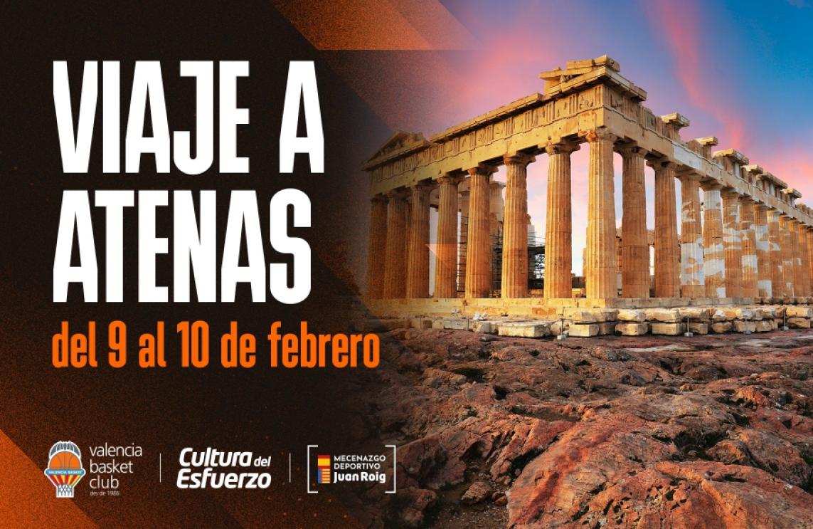 València Basket obri l'opció perquè els aficionats que vulguen fer-ho puguen viatjar en el mateix avió que el primer equip masculí de cara al partit de la J24 de la Turkish Airlines EuroLeague que l'equip taronja jugarà el 10 de febrer en la pista del Panathinaikos. El viatge inclou vol xàrter d'anada i volta, desplaçaments des d'i a l'aeroport d'Atenes, així com el desplaçament al partit, estada d'una nit en hotel de 4 estreles en allotjament i desdejuni, visita guiada per la ciutat amb guia en espanyol i menjar inclòs un dels dies, així com l'entrada per al partit del divendres 10 a les 20h.