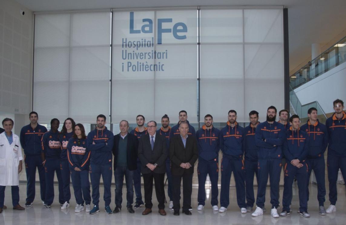 A broad representation of Valencia Basket has visited this morning, as is traditional each year at this time, children entered into the children's section of the La Fe Hospital in Valencia. The first team full roster, accompanied by the players of the Women’s team Virginia Sáez, Rebeca Cotano and Thiama Camara and the coaches Txus Vidorreta and Rubén Burgos formed a group led by President Vicente Solá and CEO Paco Raga.